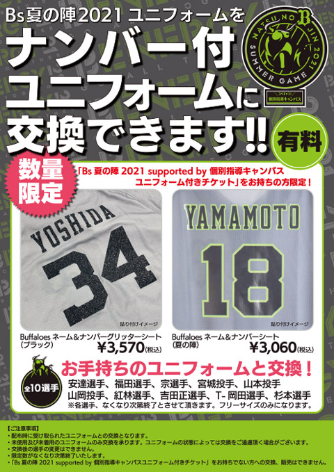 「Bs夏の陣2021ユニフォーム」をネーム&ナンバーシート圧着済みユニフォームと交換させて頂きます。